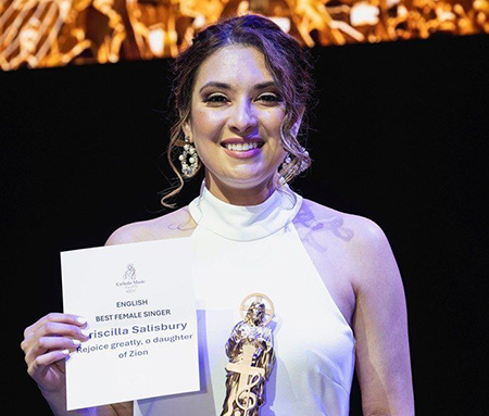Priscilla Salisbury, MM ’16, was honored with the Best Female Singer award at the inaugural Catholic Music Awards 2025 in Vatican City, for her recorded performance of "Rejoice Greatly, O Daughter of Zion" from Handel’s "Messiah." Out of 1,452 participants representing more than twenty-five countries, Salisbury was selected by an international panel of 68 judges from the music and pastoral communities.