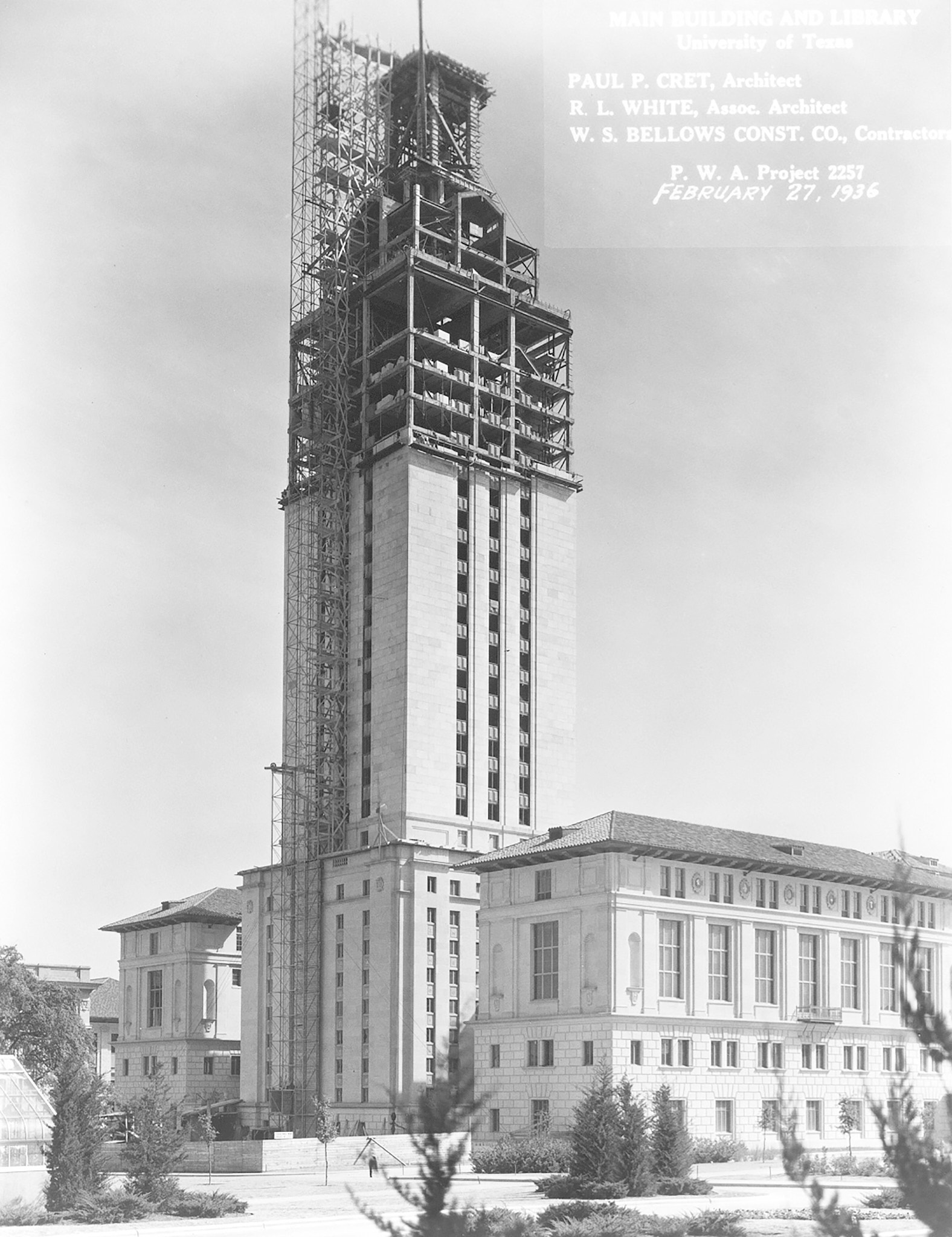 1933 // Consulting Architect Paul Phillippe Cret submits his own master development plan to the Board of Regents. Cret’s plan includes the Main Building, which replaces the demolished Old Main as a new campus centerpiece surrounded by Gilbert’s malls. Built in what Cret calls a “New Classicism” architectural style, the Main Building’s Tower becomes a counterpoint to the Texas Capitol and a defining symbol of the University.