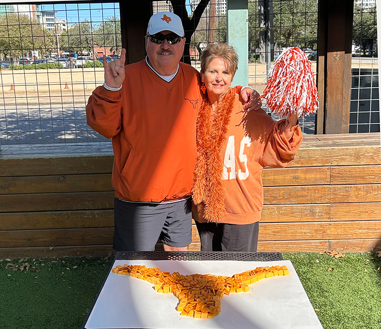 To the victor go the spoils! The Texas Exes Houston Chapter's game watches of the 2025 Cheez-It Citrus Bowl at Little Woodrow’s-Midtown and the Pit Room both featured a delicious addition: an edible longhorn encased by cheese cubes.