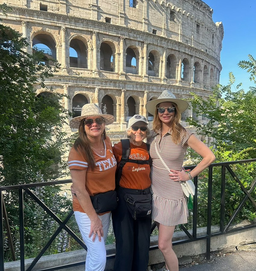 Ahead of her 80th birthday in August 2026, Dorothea Entzminger Baldwin, BBA ’68, Life Member, conquered the Roman Empire, along with her daughters Wendy Baldwin Fowler, BS ’94, and Courtney Baldwin Gill, BS ’07.