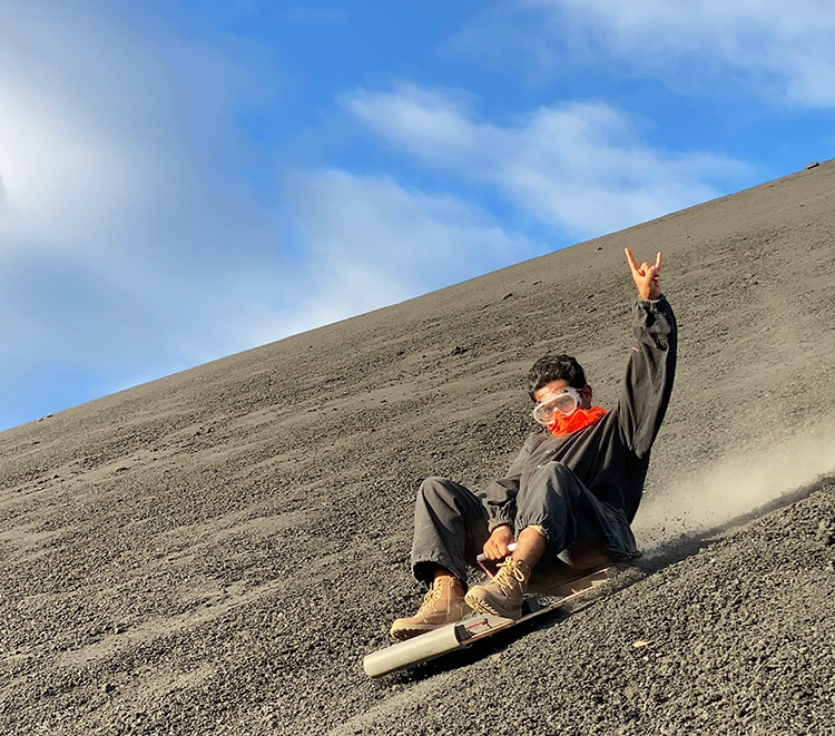 Anurag Kulkarni, BS ’23, hits the slopes of El Cerro Negro, an active cinder cone volcano in Nicaragua, as part of a three-week backpacking trip through Central America in December 2025. Kulkarni is a diehard Longhorn who worked at DKR before attending UT and brings his Texas pride everywhere he goes, including a two-month post-graduation backpacking trip from Japan to Egypt.