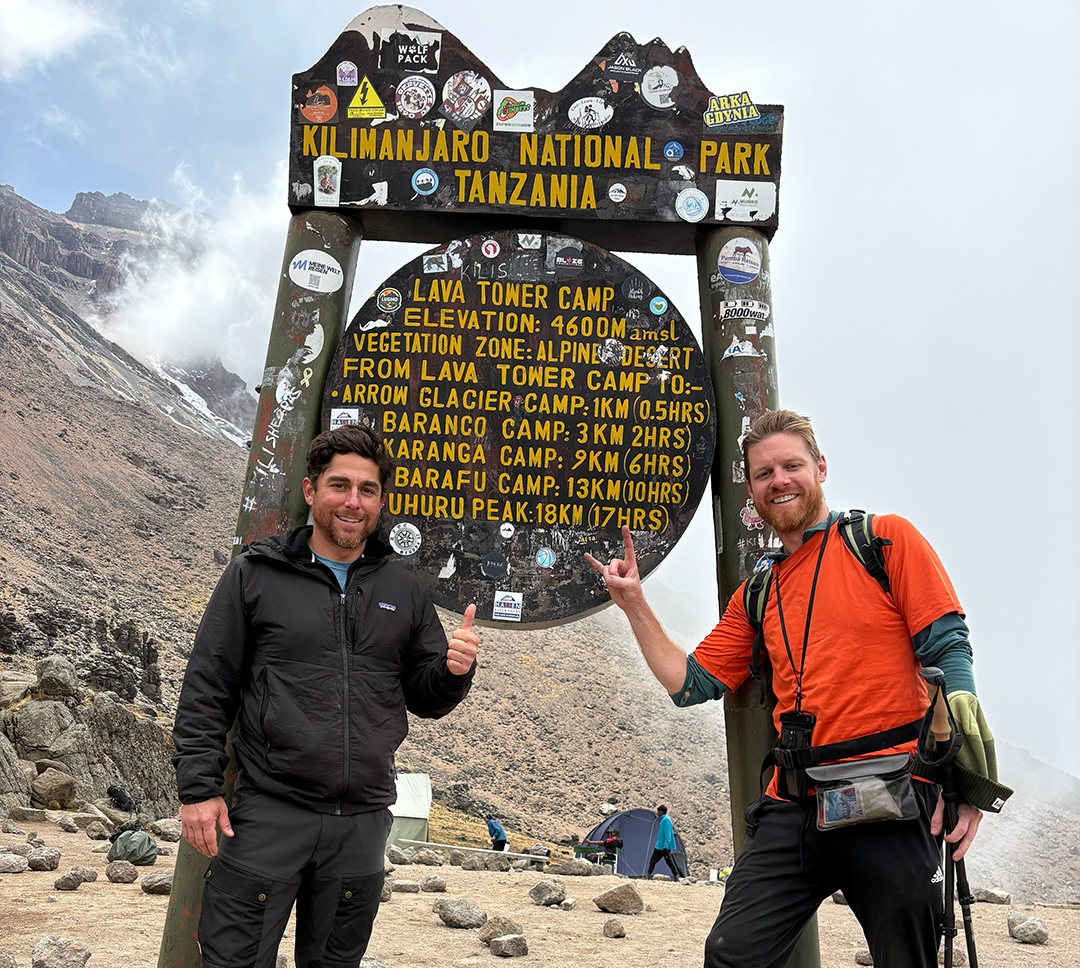 Two Longhorns on the trip of a lifetime, Bryan Herrera, BS ’06, and Andrew Caltagirone, BA ’08, reached the summit of Mount Kilimanjaro in December of 2025. Bryan's parents are Life Members Gloria Herrera and Howard Herrera, BS ’83.