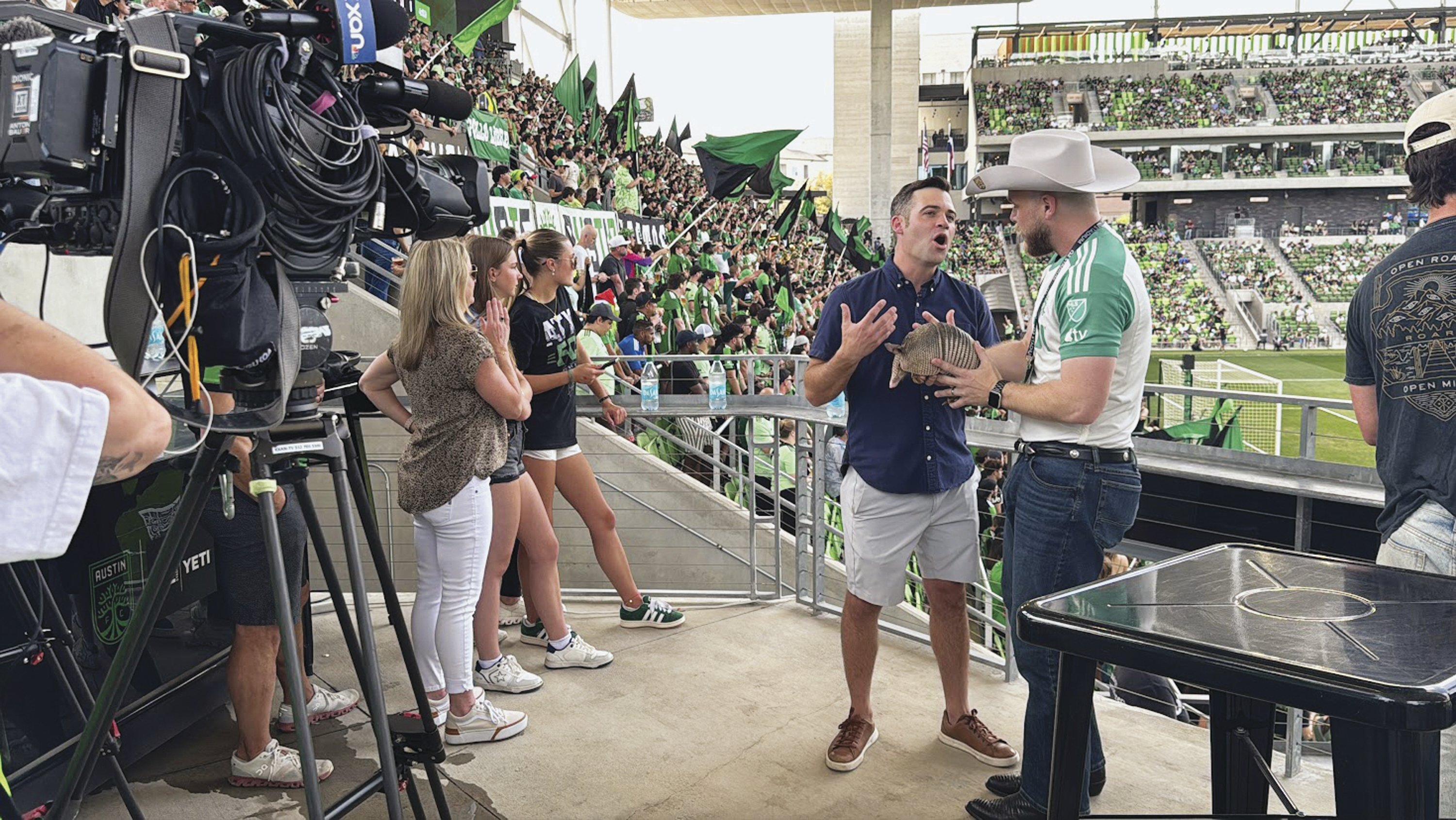 From there, Austin FC extended the invitation to Sparks and Speed Bump to appear at home matches. By 2025, the duo had coined their own ritual at the tail end of halftime, akin to the bell ringing at theater and opera events at the end of intermissions, letting audience members know they need to get back to their seats. Only, instead of an arpeggio played on a miniature xylophone, the cue is the opening instrumental section of Pharoahe Monch’s “Simon Says,” a remix that places the classic “Godzilla Approaches” musical motif from Akira Ifukube’s 1954 film score over a hip-hop beat. An animated short of a giant armadillo walking through a city fills Q2 Stadium’s video screen before cutting to live footage of Sparks and Speed Bump at field level.