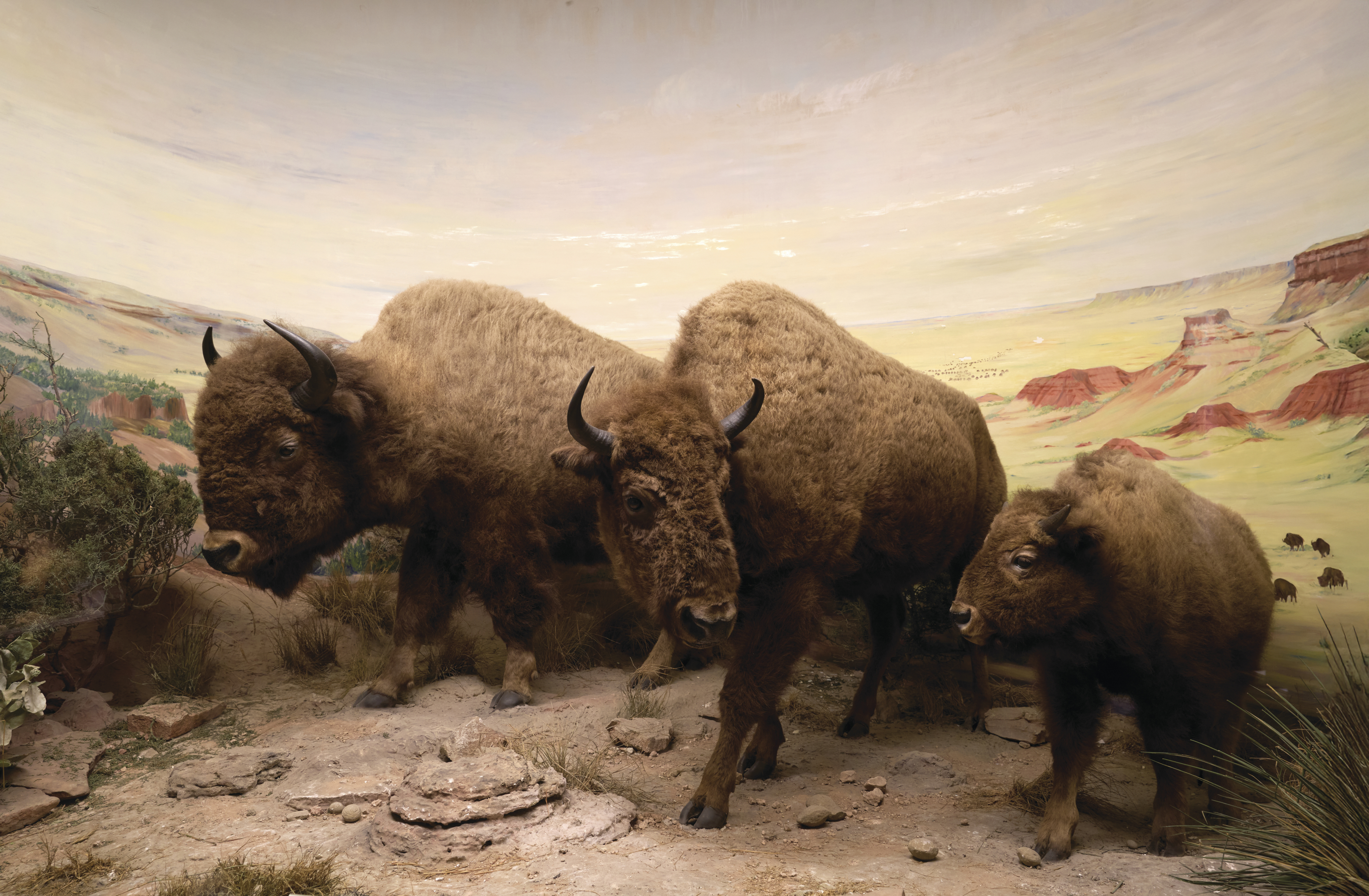 The bison were gifted to the University by the Great Southern Life Insurance Company of Dallas. Before the animals could be exhibited, however, they had to be taxidermied and mounted, a process contracted to Jonas Brothers, a Denver-based studio specializing in natural history exhibits. At the time, museums such as the American Museum of Natural History in New York City were moving away from static displays and inaccessible specimens in favor of exhibits that combined taxidermy with painted backdrops and realistic foregrounds to convey ecological context. “Dioramas are much more informative than just putting an animal on a pedestal and saying, ‘Here’s a gray fox. Here’s a roadrunner,’” says Pamela Owen, PhD ’00, associate director of the Texas Science & Natural History Museum.