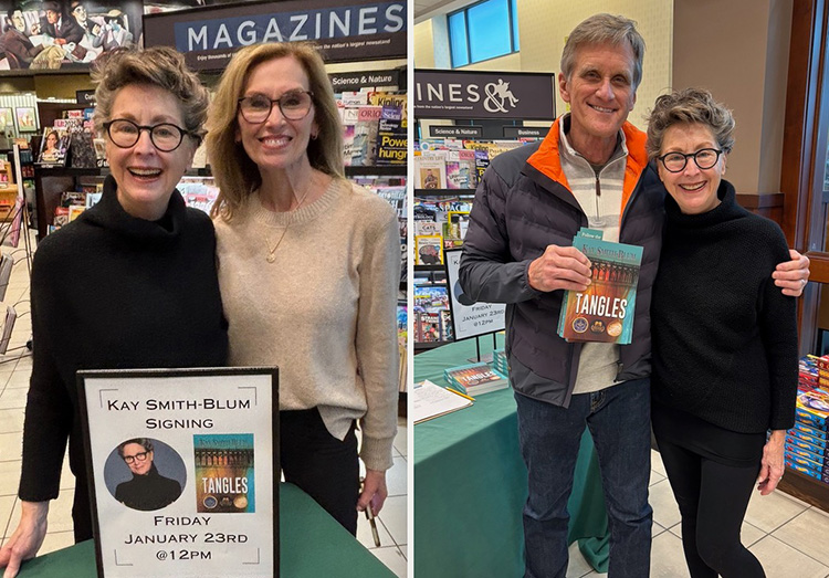 Kay Smith-Blum, BBA ’78, brought her award-winning debut novel, Tangles, to six sold-out book signings across Texas. While in Dallas, she reunited with Jennifer Hay Russell, BS ’73, who was a fellow member and officer in Alpha Chi Omega, as well as Harold Simpson, ’70.
